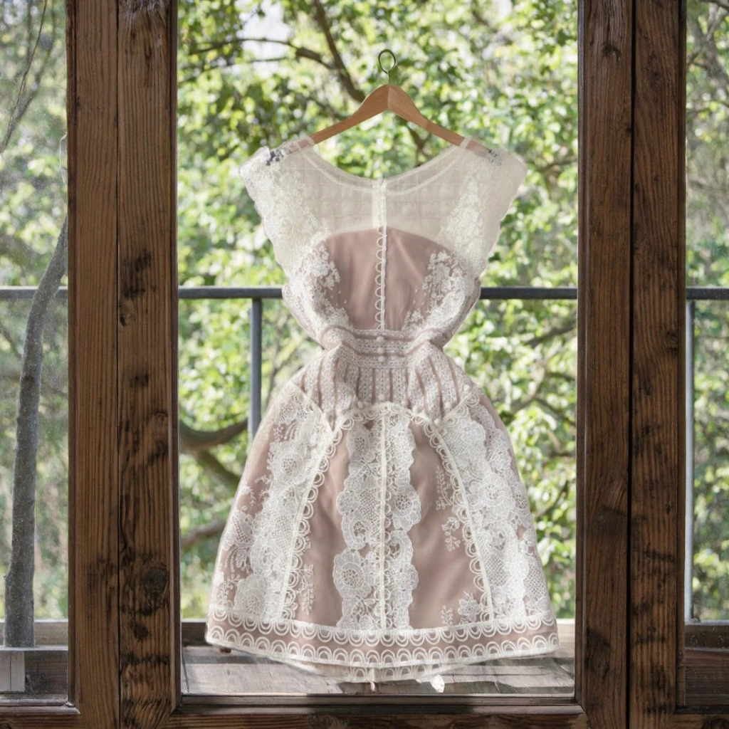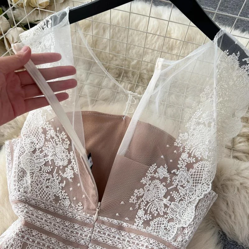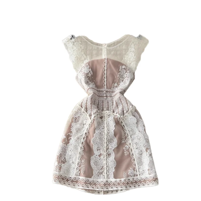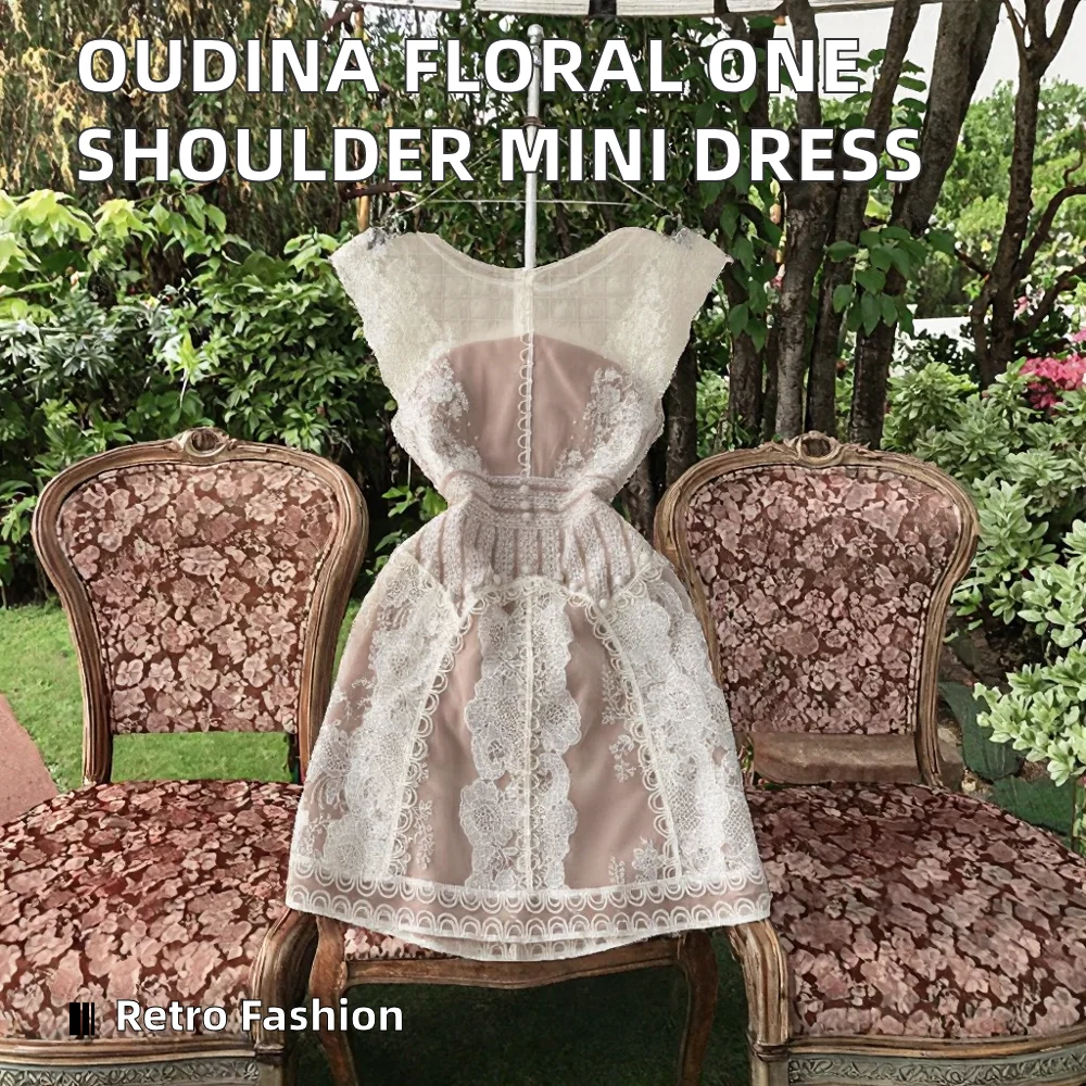 OUDINA Vietnam Elegant Summer One-Shoulder Embroidered Flowers Short Mini Dress for Women Plain Dyed Lace for Party Evening